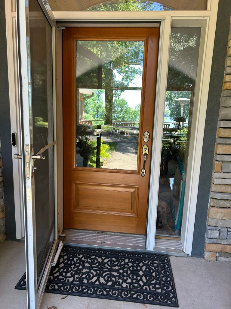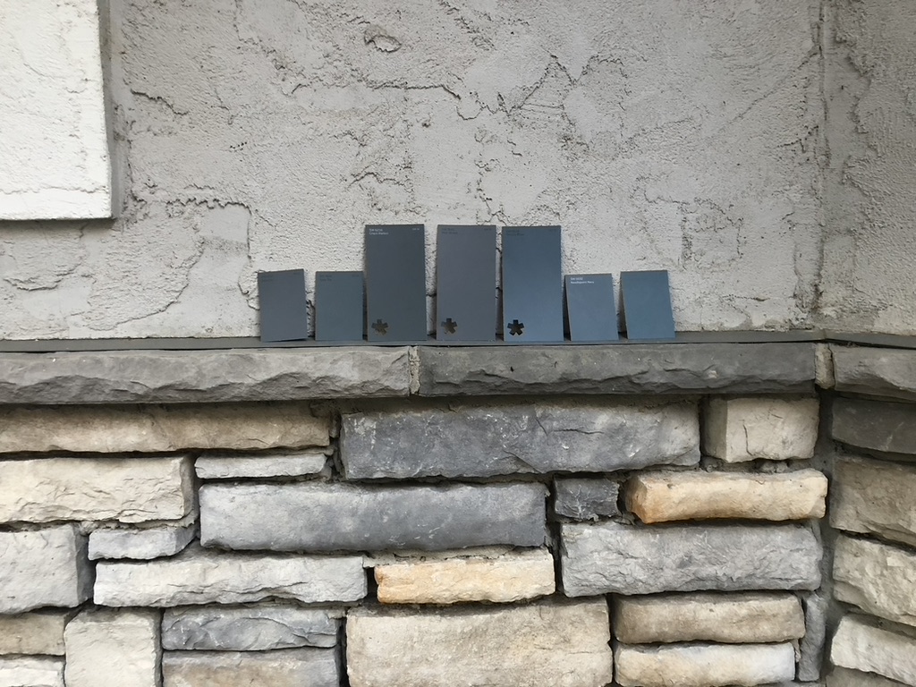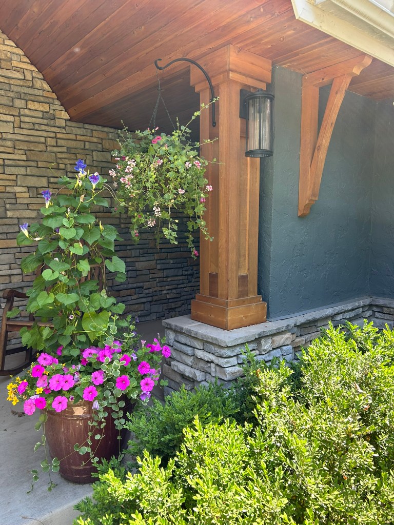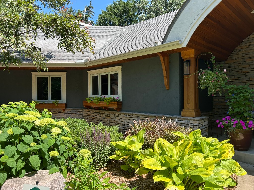 The grey exterior of this house faded into the background and made the house invisible. Roycroft Pewter in a stucco friendly paint made the home and stonework pop. The addition of cedar pillars, corbels, and window boxes added warmth to the house. And a new wood front door let the light and the company in. The result was a house that said “Welcome Home.”